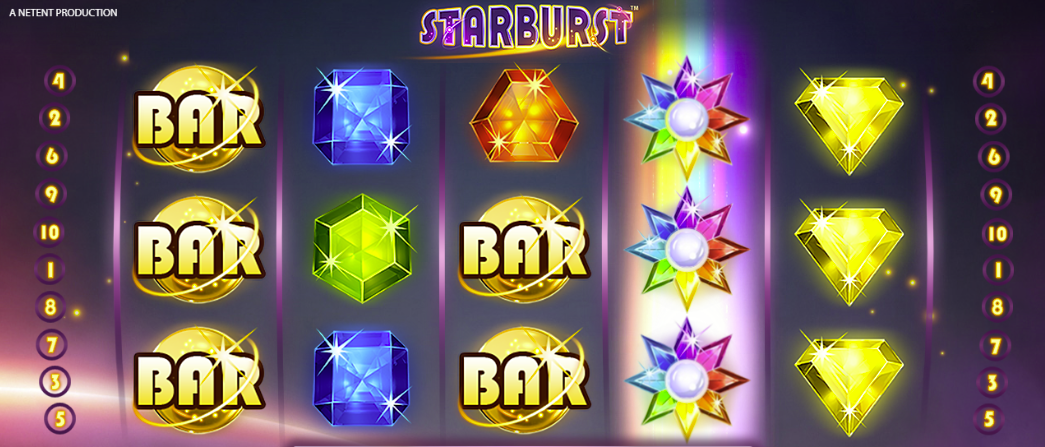 Starburst uses a simple 5-reel, 3-row layout with 10 fixed paylines. Wins are formed by landing matching symbols on adjacent reels from either left to right OR right to left (Both Ways), effectively doubling your chances on every spin. The gameplay is fast-paced, with wins triggering satisfying gem-crushing animations.
